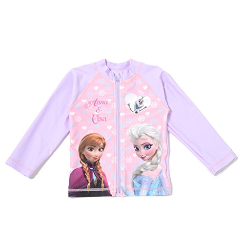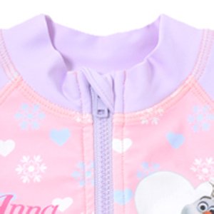 UV加工のラッシュガードジャケット。前身頃にアナとエルザ、オラフの人気キャラクターをプリントし海やプール、山等で紫外線を通しにくくし活躍します。