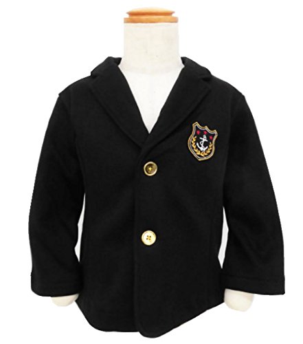 厚地カットソー素材でメタルボタンと胸部分のエンブレムがポイントのテーラードジャケット。裏は縫い代をパイピング処理した丁寧な縫製。入園入学、発表会や七五三など幅広くお使いいただける1枚です。