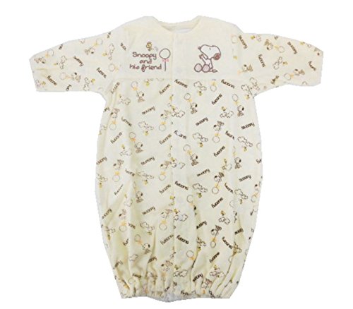 スヌーピーのベビー服です。パイル地なのでふわふわ。赤ちゃんの発育や用途に合わせて、ドレスまたはカバーオールの2通りに着せられます。出産祝いなどのギフトにもオススメです。