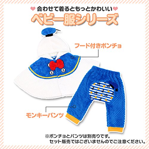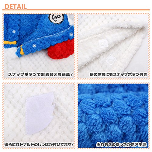 ベビーサイズのポンチョが新登場☆男の子や女の子が大好きなディズニーキャラクター、ドナルドのフード付きポンチョです。スナップボタンでお着替えも楽々な前開きタイプ。裾にもスナップボタンがついているので、動き回るベビーにもぴったり♪ふわもこのフリース生地は寒い季節の防寒対策にもおすすめです。同じ生地を使用した、別売りのモンキーパンツもあるので合わせて着るともっとかわいい!プレゼントにも最適です。