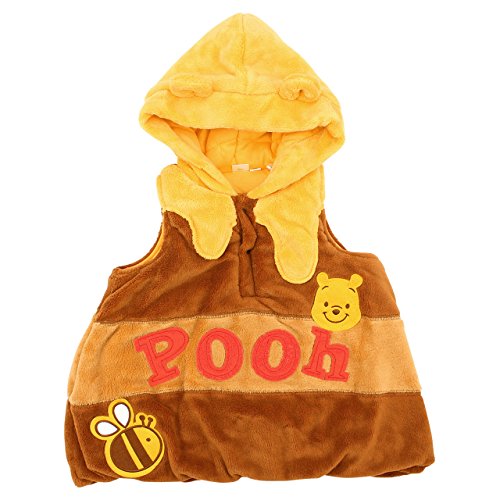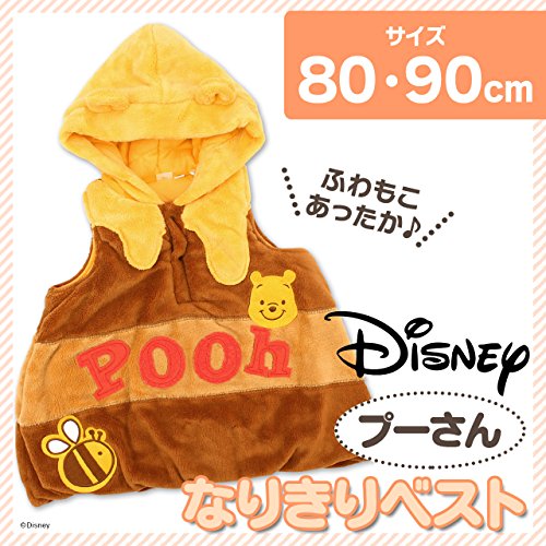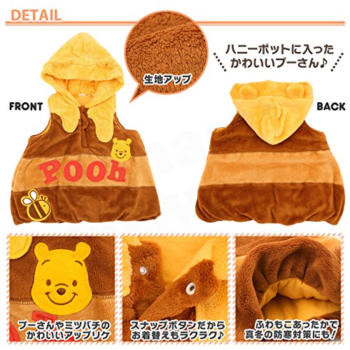 ベビーサイズのベストが新登場☆男の子や女の子が大好きなディズニーキャラクター、くまのプーさんのフード付きベストです。プーさんがハニーポットに入っているかわいいデザイン!スナップボタンでお着替えも楽々♪ふわもこのボア生地を使用した、寒い季節の防寒対策にもおすすめのアイテムです。プレゼントにも最適!