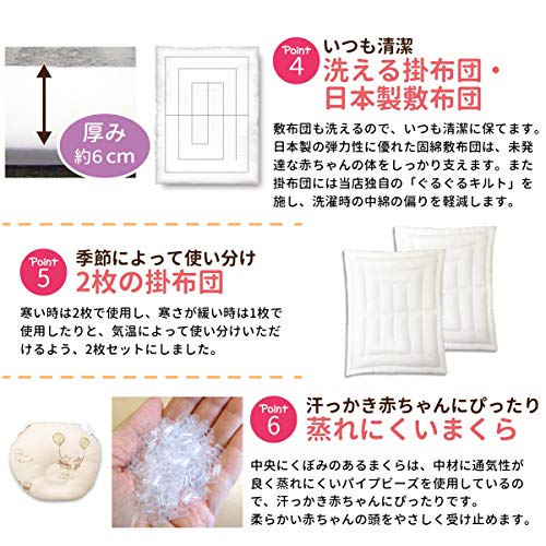 - 掛布団中芯は2枚入り! 寒いときは2枚で使用し、寒さが緩い時は1枚で使用できるので季節に合わせてお好みでご使用頂けます。敷布団は厚み6cmの日本製固綿を使用しています。成長途中のあかちゃんの骨や筋肉は未発達ですが、適度な硬さと弾力性のある固綿敷布団でしっかりと体を支え、安心してご使用頂けます!