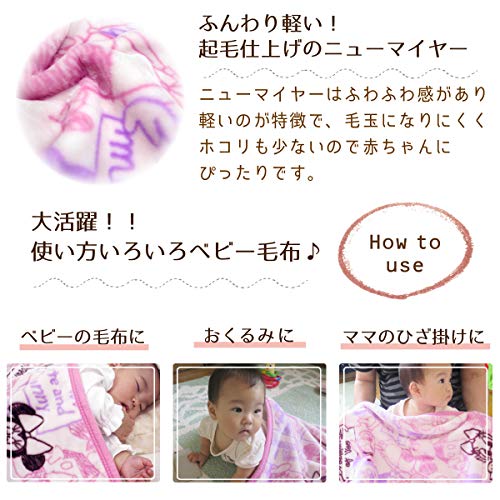 - ふんわりやわらかいニューマイヤー毛布は、ベビーにかぶせても重くないので安心です。ベビー毛布・おくるみ・ママのひざかけ等、使い方いろいろで大活躍♪