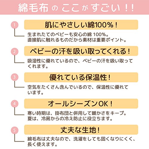 - 生まれたてのベビーの肌にも優しい綿100%。吸湿性に優れているので、ベビーの汗を吸い取ってくれます。空気をたくさん含んでいるので、保温性にも優れています!綿毛布は丈夫なので、洗っても固くなりにくく、長く使えます。寒い時期は、掛布団と併用して暖かさをキープ。夏は、冷房から冷え防止に役立ちます。