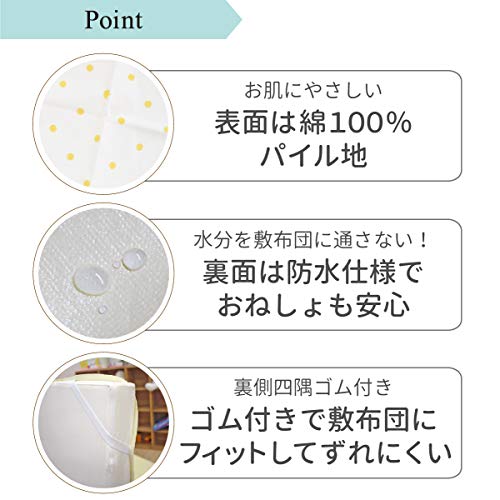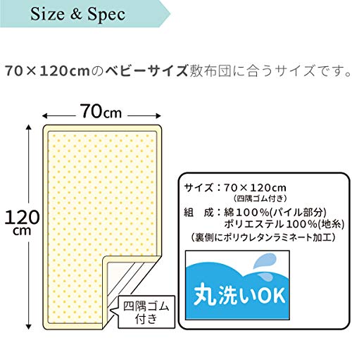 - 【サイズ】70×120cm 四隅ゴム付きで、ベビー敷布団にぴったりフィットします ≪洗濯可能≫ 【組成】パイル部分:綿100% (地糸:ポリエステル100%)・ 裏側:ポリウレタンラミネート加工(防水加工)