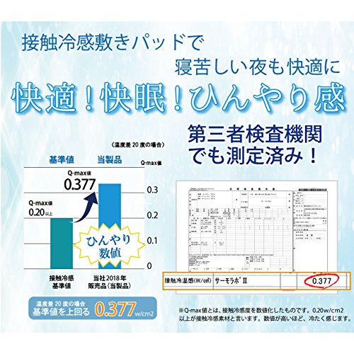 - Q-max値は、基準値(0.2w/cm2 )を大きく上回る0.377w/cm2。 第三者検査機関で接触冷感試験を行いました。※Q-maxとは人が物を触ったときに「冷たい」「温かい」を感じる接触冷温感の指標として最大熱吸収速度(Q-max)で表し、数値化したもので数値が大きいほど冷たく感じます。