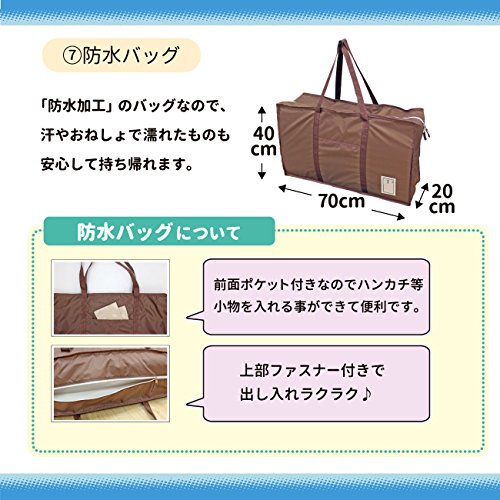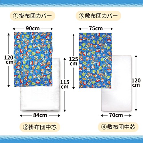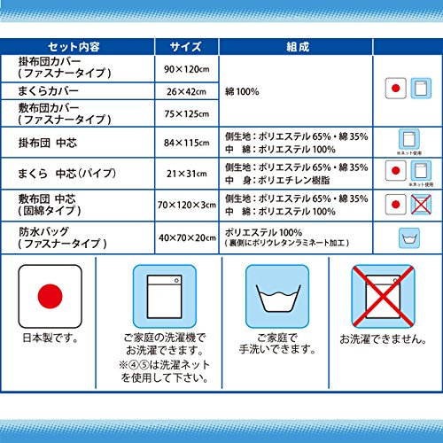 - 掛布団カバー:90×120cm、掛布団中芯:84×115cm、敷布団カバー:75×125cm、敷布団中芯:70×120cm、まくらカバー:26×42cm、まくら中芯:21×31cm、防水バッグ:40×70×20cm
