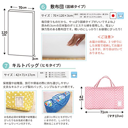 - [本体サイズ] 掛布団カバー:90×120cm、掛布団中芯:84×115cm、敷布団カバー:75×125cm、敷布団中芯:70×120cm、まくらカバー:26×42cm、まくら中芯:21×31cm、キルトバック:71×42×17cm (お昼ね布団は、保育園・幼稚園のお昼ね用として、持ち運びに便利なよう簡易的に作られていますので、新生児の長時間の睡眠には適しておりませんのでご注意下さい。)