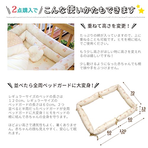 - 重ねて高さを変更!たっぷりの綿が入っていますので上に重ねることも可能です。ヒモを柵に結んでご使用頂けます。もう少し高さが欲しいときに便利♪少し動けるようになった赤ちゃんでも柵で頭や手をぶつけません。2つ並べると半周だったベッドガードが全周ベッドガードに大変身!ほどよい高さで通気性もよく暑くありません。赤ちゃんの頭も見えやすく赤ちゃんも安心して眠れます。