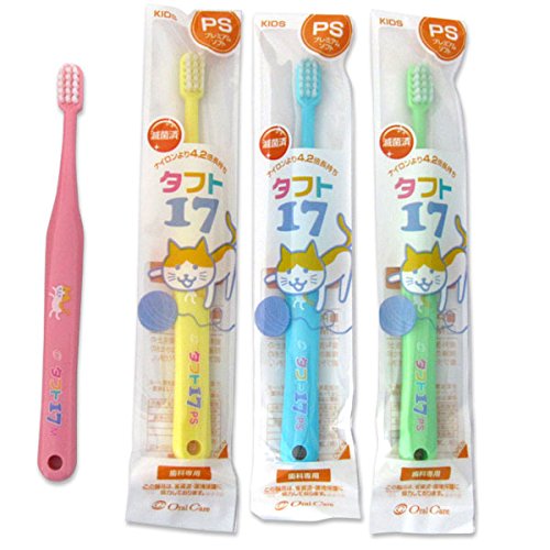 従来の性能はそのままに、さらに磨きやすく・使いやすく・可愛くなりました タフト17は 「お子さんの初めて使う歯ブラシ」におすすめの商品です。 乳歯の微妙な隙間にも毛先がすっと入り、小さめヘッドで奥歯もしっかり磨けます。 お子さんのお口に合わせた特別な素材を使用しているので、まだ歯みがきが上手にできず、歯ブラシを遊び噛みするお子さんにも安心してお使いいただけます。 商品リニューアルで、お子様の心をぐっとつかむキャラクタープリントも採用されました。歯磨きを嫌がるお子さんにも、「猫ちゃん可愛いね、一緒に歯みがきしようね」などの声かけもしやすいですね 【かたさ選びのポイント】 ブラシを噛んでしまう癖のあるお子さんには、耐久性が高いM(ミディアム)を。 小さなお子さんのデリケートな歯肉や、ゴシゴシ磨きで歯肉を傷めやすいお子様には、PS(プレミアムソフト)がおすすめです。 【備考】 全長:141mm ※従来品より約6~7mm程度長くなります ナイロン毛より4.2倍長持ち