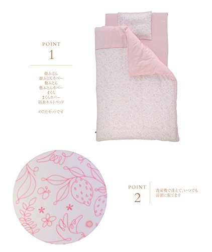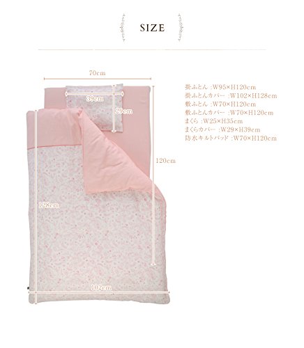 サイズ:掛ふとん :W95×H120cm 、掛ふとんカバー :W102×H128cm 、敷ふとん :W70×H120cm 、敷ふとんカバー :W70×H120cm 、まくら :W25×H35cm、まくらカバー :W29×H39cm 、防水キルトパッド :W70×H120cm