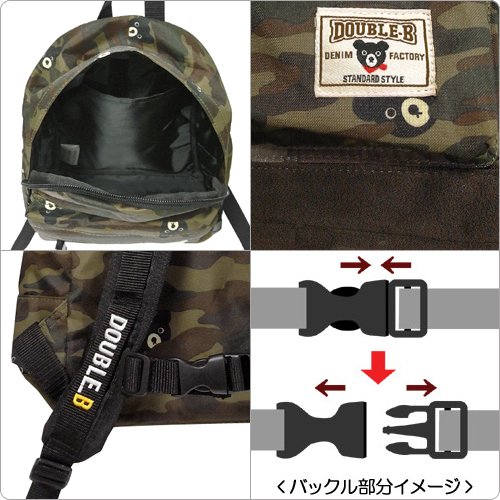 迷彩柄とブラックベアのお顔がコラボしたカッコイイ!!リュックです★ 渋めの色合いで、ミリタリー好きにはたまらない仕上がりです! 両開きのダブルファスナーで大きく開閉し、出し入れしやすく便利。 しっかりとした素材で、型崩れしにくく、お子様でも使いやすいのが嬉しいポイント。 外側にはマチのある小さなポケットをつけました。 本体内側にもポケットつき。 肩ベルトには、ずれ落ちないようにチェストベルト付けました。 しっかりと背負えて便利です。 肩ベルト・チェストベルトともに調節可能です。 兄弟お揃いでオシャレグッズを使ってみませんかっ♪ ●サイズ:W20×H25×D10cm ●容量:4L ●重量:205g