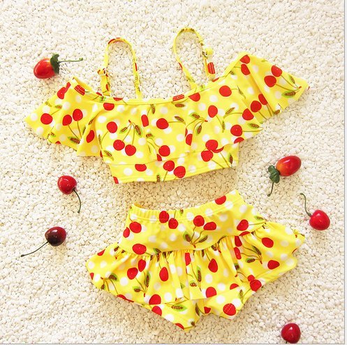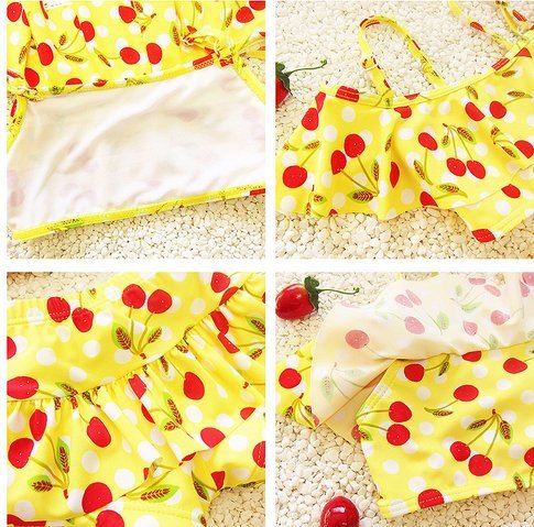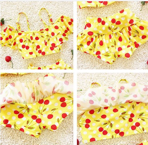 ツバメ--屋 ベビー水着 女児水着樱桃 ビキニ スイミングウェア キッズ水着 子供用 非常にオシャレ、樱桃トップス、パンツ2点セット (L, イエロー)