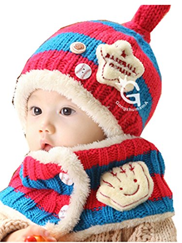 ツバメ--屋 ニット帽子&マフラーのセット 耳&肩まであたたか 毛糸 可愛い耳付き帽子 ケープ ベビー キッズ 赤ちゃん ふわふわ 男の子 女の子 キュート 防寒 スタイリッシュ ボンボン付き 男女児 秋冬 防寒 (ブルー+ローズ)