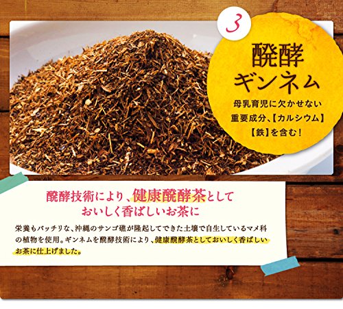- ウーロン茶の約50倍ものカルシウム、鉄などのミネラルを含む醗酵ギンネムと、妊娠中・産後の体型維持にうれしい黒豆をブレンド。