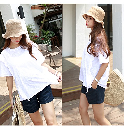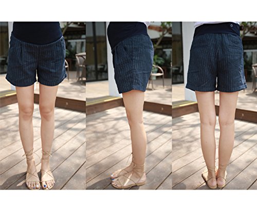 【bttm102929】マタニティ パンツ リネン100% 麻 ストライプ 折り返し ショートパンツ (M, ネイビー)