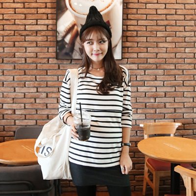 カジュアルボーダー柄 ヘムライン サイドスリット入 授乳服 トップス【20000109210】 (アイボリー)