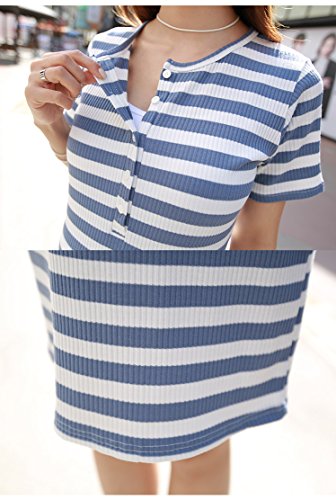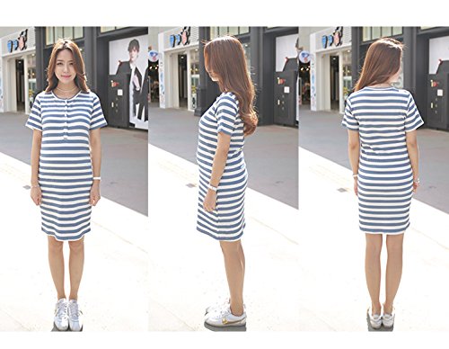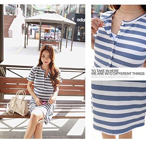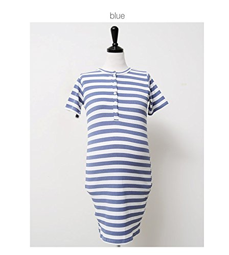 【cd108820】綿100% ボーダー柄 前ボタン 授乳可能 マタニティ ワンピース 授乳服 (フリー, ブルー)