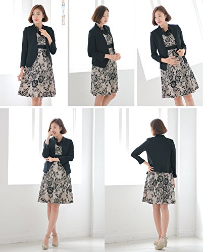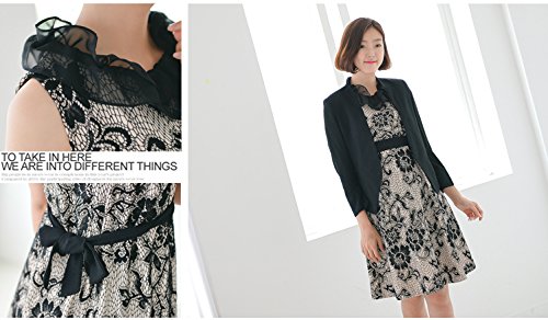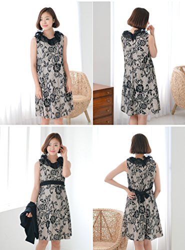アイボリーの生地にブラックのレースで全体に華やかな花柄が描かれている上品でエレガントなフォーマルワンピース☆ きれいなAラインで女性らしさを一層引き立ててくれます。 結婚式や二次会、お宮参り等のフォーマルなシーンで大活躍!! デザイン、縫製と全てにおいてクオリティーの高いスタイリッシュなママのためのアイテムです。 襟部分はブラックのシフォン生地が2枚重なっているので顔周りを華やかに見せてくれます。 もちろん裏地がついているので透ける心配はありません。 シフォン生地のリボンがセットだからお腹の大きさに合わせて、シルエットを変化させることができます。 正面で結んでもよし、ちょっと横にずらしてもよし!! 胸下で結ぶのが脚長効果もあってオススメ☆ しっかりした生地なので産前はもちろん、出産後も長く着てもヨレヨレになったりしません。 カラー:ブラック サイズ:フリー