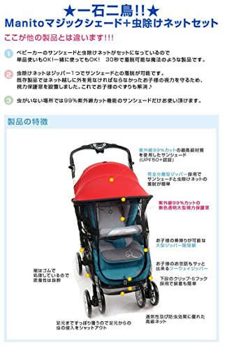 日よけのみの使用も可能。ジッパー一つで日よけと虫よけネットが一体になるので環境に合わせて便利にお使い頂けます。日よけはベビーカーだけでなくチャイルドシートにも使えます。また虫よけネットをつけたまま、子どもの乗降りが可能になっています。※お使いのベビーカーに試着される際は必ず視力保護窓に貼ってある保護用ビニール(青色)を剥がさずに試着して下さい。保護用ビニールを剥がされますと返品を承ることができかねますのでご注意下さい。