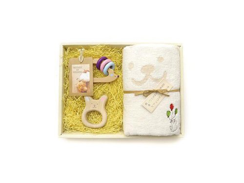 【税抜き定価:3,500円】 はじめて贈るギフトはママとbabyに優しいものを。 最高級オーガニックコットンを使ったコットンシリーズと安全基準を満たした安心の木のおもちゃをセットしました。シンプルでいて毎日使えるものだからママとbabyの笑顔がうかんできますね。 ナチュラルなイメージのギフトパッケージに仕上げています。 クマさんが風船でお散歩を楽しんでいる可愛いハンドタオルは最高級オーガニックを使用しているのでデリケートなベビーにも安心です。 はじめて赤ちゃんが触れるおもちゃは優しい天然木でできたラトルで。小さな手にも握りやすく設計されています。振ると優しい木の鳴るので赤ちゃんもご機嫌!五感を刺激する木のおもちゃです。 【ご使用上の注意】※この積み木は、柔らかい天然無垢材(桐)を使用しております。 赤ちゃんによっては口に入れたり、歯が生え始めた頃に噛んだりすることがあります。 口に入れても安全な素材ですが、噛み続けると木の繊維が剥がれる場合がありますので、誤ってお子様が口の中を傷つけないように、保護者の元で遊ばせてください。 【注意】・天然素材、ハンドメイドの為、1点1点、多少異なる場合があります。・製造時期によって、色やデザイン、パッケージなど画像と多少異なる場合があります。・表記寸法より多少の誤差が生じる場合もあります。