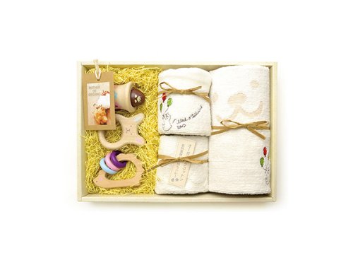 【税抜き定価:7,000円】 はじめて贈るギフトはママとbabyに優しいものを。 最高級オーガニックコットンを使ったコットンシリーズと安全基準を満たした安心の木のおもちゃをセットしました。シンプルでいて毎日使えるものだからママとbabyの笑顔がうかんできますね。 ナチュラルなイメージのギフトパッケージに仕上げています。 クマさんが風船でお散歩を楽しんでいる可愛いハンドタオルは最高級オーガニックを使用しているのでデリケートなベビーにも安心です。 はじめて赤ちゃんが触れるおもちゃは優しい天然木でできたラトルで。小さな手にも握りやすく設計されています。振ると優しい木の鳴るので赤ちゃんもご機嫌!五感を刺激する木のおもちゃです。 【ご使用上の注意】※この積み木は、柔らかい天然無垢材(桐)を使用しております。 赤ちゃんによっては口に入れたり、歯が生え始めた頃に噛んだりすることがあります。 口に入れても安全な素材ですが、噛み続けると木の繊維が剥がれる場合がありますので、誤ってお子様が口の中を傷つけないように、保護者の元で遊ばせてください。 【注意】・天然素材、ハンドメイドの為、1点1点、多少異なる場合があります。・製造時期によって、色やデザイン、パッケージなど画像と多少異なる場合があります。・表記寸法より多少の誤差が生じる場合もあります。