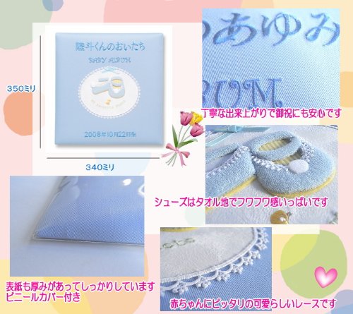 補充台紙 付きでこの値段! 出産祝い に・・丁寧な 刺繍 名入れ 一生使える ベビー アルバム C065-321/322 (ブルー)