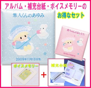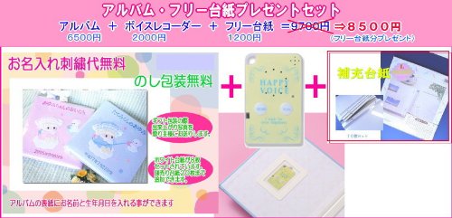 一番の成長記録は何かな?■やっぱりその時、その時の写真かな・・・■デジタルもいいけど温かみを感じるのはアナログ■物語風に編集していけば一番■そして一生の宝物そんな写真物語編集するにはオリジナルタイトルの表紙アルバムをオススメします。アルバムの表紙に熟練職人がお名前と生年月日をお入れいたします。 ふわふわした赤ちゃんのかわいい思い出を温かみのあるかわいらしいアルバムに残してください お名前と生年月日が入っているから、その子一人だけのメモリアルとして きっと喜んでもらえるでしょう。 お誕生のお祝いとしても人気のあるアルバムです お名入れ内容はご注文後メールにてご確認させていただきます。 お名入れ内容ご確認後約3週間でお届けいたします。 補充台紙10枚とボイスレコーダーをセット