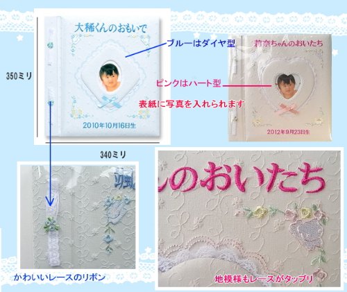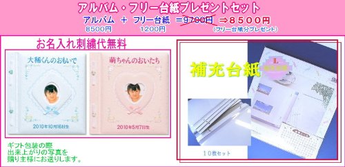 一番の成長記録は何かな?■やっぱりその時、その時の写真かな・・・■デジタルもいいけど温かみを感じるのはアナログ■物語風に編集していけば一番■そして一生の宝物そんな写真物語編集するにはオリジナルタイトルの表紙アルバムをオススメします。アルバムの表紙に熟練職人がお名前と生年月日をお入れいたします。 ふわふわした赤ちゃんのかわいい思い出を温かみのあるかわいらしいアルバムに残してください お名前と生年月日が入っているから、その子一人だけのメモリアルとして きっと喜んでもらえるでしょう。 手足を汚さない手形足形インク用紙をセット お誕生のお祝いとしても人気のあるアルバムです お名入れ内容はご注文後メールにてご確認させていただきます。 お名入れ内容ご確認後約3週間でお届けいたします。 補充台紙10枚をセット