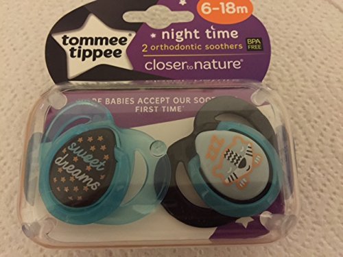 Tommee tippee 6-18 months;NIGHT TIME ORTHODONTIC SOOTHERS;BPA FREE;CLOSE TO NATURE