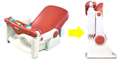 組立不要で簡単に折りたたんで収納できるベビーバスチェア。折りたたみ、リクライニングもワンタッチ。狭いスペースでも邪魔にならない。操作は安心のダブルアクション方式。セーフティーバーにはおもちゃが付いている。