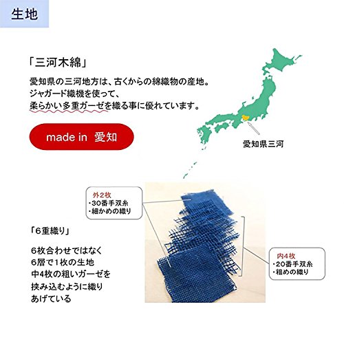 - 【三河木綿】愛知県の三河地方は、古くからの綿織物の産地。ジャガード織機を使って、柔らかい多重ガーゼを織ることに優れています。【6重織り】6枚合わせではなく6層で1枚の生地。中4枚の粗いガーゼを挟み込むように織り上げています。外2枚は30番手双糸の細かめの織り、内4枚は20番手双糸の粗めの織りになっています。