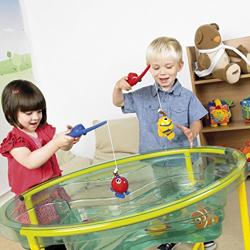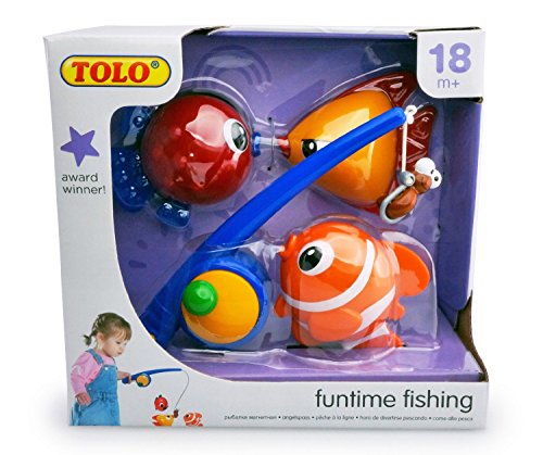 Tolo Toys Fun time Fishing comes complete with a fishing rod, a cheerful magnetic worm for 'bait,' and three brightly colored fish to catch. Submerge the fish in the tub and watch them blow bubbles before using the magnetic worm to 'hook' the fish and wind the attached reel to catch them. When your child has mastered the fishing part of the game, make it a contest by taking turns to see who can catch a fish the fastest or catch the most fish in a certain amount of time. Bubbling Fish Makes Bath Time Fun It's fun to show your little fisher how to hold the fishing rod to catch a bubble-blowing fish with the worm, and then use the reel with the other hand to wind it in. This toy develops the psychological skills of perseverance and patience as well as the physical skills of hand-eye coordination and dexterity. Kids and Parents Can Enjoy Interactive Play You can use the fun of this bath time fishing game to teach words like 'float,' 'sink,' 'underwater,' and 'bubble' as your child learns the unique properties of water. Encourage imaginative play by making up stories about the fish and their life underwater. Bring the Fun time Fishing set into the playroom, and your child can use the magnetic worm to 'catch' other small metal toys, even out of the water.