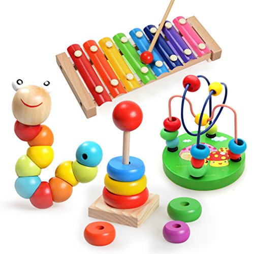 [ドリーマー] 知育玩具 4点セット 木製 木琴 ハーモニカ ビーズコースター ジャイロ 毛虫 棒さしおもちゃ 積み木 赤ちゃん キッズ 子供 早期開発 幼児 カラフル 女の子 男の子 プレゼント ギフト お祝い