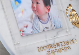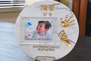 赤ちゃんの手形・足形のストーンプレートです。 誕生記念、出産祝いのプレゼントにオススメです。 また、最近赤ちゃんが生まれた方へのプレゼントとしても大変好評です!(スタンド付属) 磨いてあるキレイな大理石に手形・足形・お名前・生年月日・体重などを刻みます。 お客様にお送りする付属の手形キットに入っている発色紙に赤ちゃんの手形・足形を押し生年月日など、必要事項を記入して同梱の返送用封筒で当社に送るだけです!