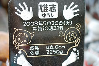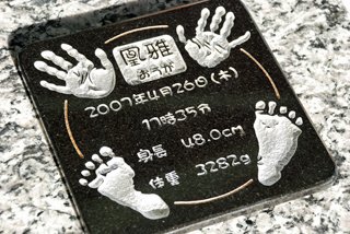 赤ちゃんの手形・足形のストーンプレートです。 誕生記念、出産祝いのプレゼントにオススメです。 また、最近赤ちゃんが生まれた方へのプレゼントとしても大変好評です!(スタンド付属) 磨いてあるキレイな御影石に手形・足形・お名前・生年月日・体重などを刻みます。 お客様にお送りする付属の手形キットに入っている発色紙に赤ちゃんの手形・足形を押し生年月日など、必要事項を記入して同梱の返送用封筒で当社に送るだけです!
