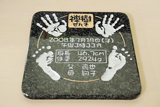 赤ちゃんの手形・足形のストーンプレートです。 誕生記念、出産祝いのプレゼントにオススメです。 また、最近赤ちゃんが生まれた方へのプレゼントとしても大変好評です!(スタンド付属) 磨いてあるキレイな御影石に手形・足形・お名前・生年月日・体重などを刻みます。 お客様にお送りする付属の手形キットに入っている発色紙に赤ちゃんの手形・足形を押し生年月日など、必要事項を記入して同梱の返送用封筒で当社に送るだけです!