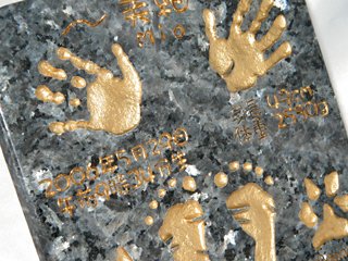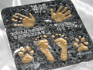 赤ちゃんの手形・足形のストーンプレートです。 誕生記念、出産祝いのプレゼントにオススメです。 また、最近赤ちゃんが生まれた方へのプレゼントとしても大変好評です!(スタンド付属) 磨いてあるキレイな御影石に手形・足形・お名前・生年月日・体重などを刻みます。 お客様にお送りする付属の手形キットに入っている発色紙に赤ちゃんの手形・足形を押し生年月日など、必要事項を記入して同梱の返送用封筒で当社に送るだけです!