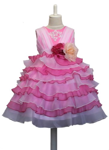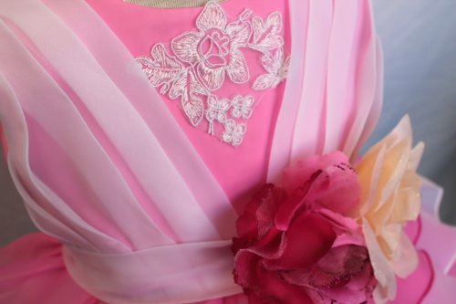 - 刺繍のワンポイントが施されています。目を引くティアードスカートはピンクとホワイトを交互6段重ねの豪華さです。