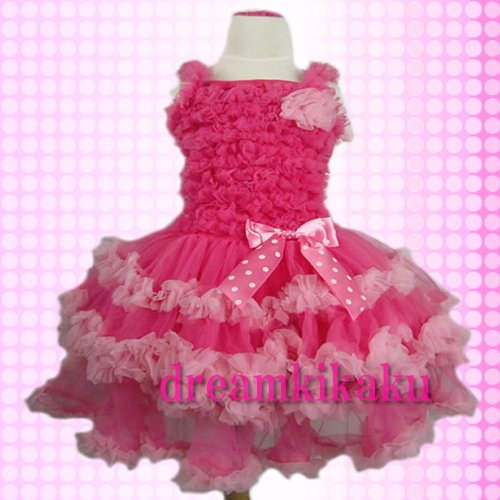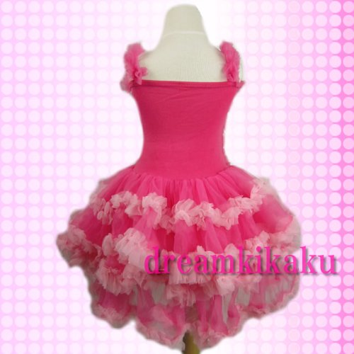 - 胸元のまあるいコサージュに、ウエストの水玉リボン。ホットピンクとピンクのふりふり3段ティアードのスカートが可愛さ満点です!