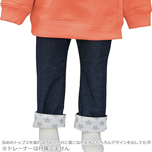 ニットのデニム風のズボンです。伸縮性があり、ぴったりとしたスタイル。裾はまくるとおなかの平ゴムと同じ星模様。まくらなくても、とってもスタイリッシュです。表側のプリントは、長めのトップスと合わせると見えなくなるので、おしゃれに着こなせます。