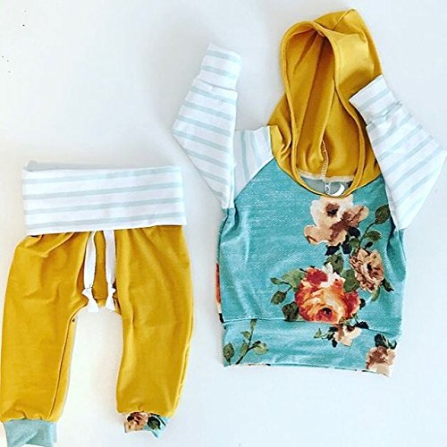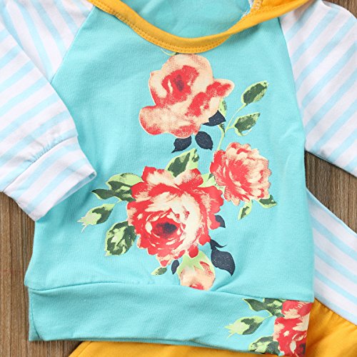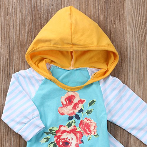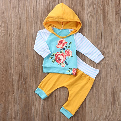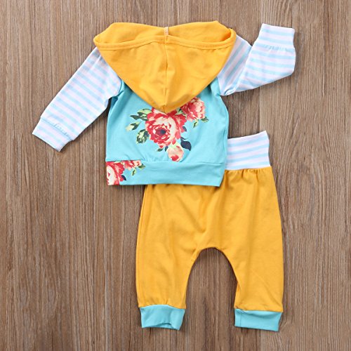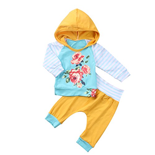 ベビー服 幼児 赤ちゃん スウェット パーカー 黄色のパンツ 上下 2点セット フード付き 3色の切り替えの長袖 長ズボン 花 プリント 女の子 カジュアルウエア セットアップ 春 秋 冬 お出かけ (12-24M)