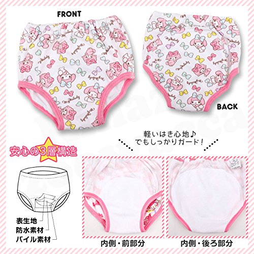 女の子に大人気!マイメロディからトレーニングパンツが登場しました!雰囲気の違うキュートなマイメロ柄が描かれた、とってもお得な柄違いの3枚組!表生地・防水素材・パイル素材の3層構造で、軽い履き心地☆でもしっかりガードしてくれるので安心です◎「そろそろおむつを卒業したい」というお子様が普通のパンツに移行する前の練習として使えます!本体部分は肌にやさしい綿100%。大好きなキャラクターパンツでお子様の成長を応援します♪
