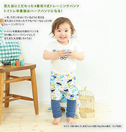 - お 部 屋 の 中 で の ト イ ト レ は コ レ 1 着 で O K ! アニマル柄のハーフパンツと吸水層付きのパンツがウエスト部分で繋がった吊り式タイプのトレーニングパンツ!トレパンの上からズボンをはかせる手間がなくお部屋の中でのトイトレならこれ1着でOK!画像のように内側にある吸水層付きパンツを表に出せばお洗濯も乾きやすくてママもにっこり♪