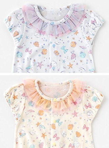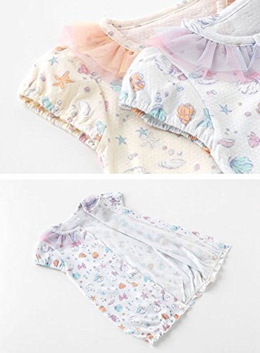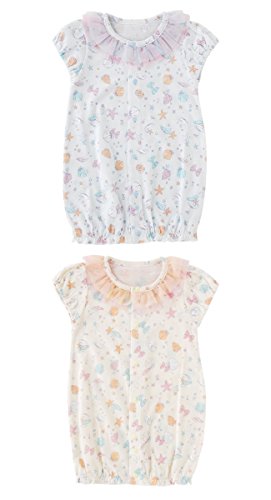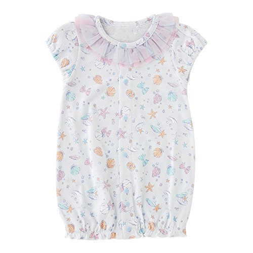 襟ぐりのチュールやプリントが可愛い、新生児半袖ショート丈ツーウェイオールです。夏生まれのベビーにピッタリ!!新生児のねんね時期はドレスとして、活発に足を動かし始めたら、足元のホックをとめ替えてカバーオールとして着せてあげましょう。 製造国:中国 素材・材質:本体:綿100%チュール:ポリエステル100% 仕様:洗濯機使用可乾燥機使用不可