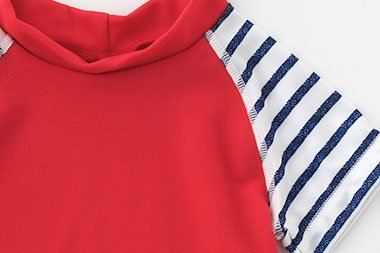 ベビーのお肌を日焼けや冷えから守るベビー用ラッシュガード。首回りも包むハイネックのTシャツタイプの半袖ラッシュガードです。前開きのファスナー等がないのでお腹への負担がありません。胴体などに使用している無地の生地は吸水・撥水・通気に優れたデュアルマジックを使用。生地の濡れ感を軽減し、暖かく感じられます。■素材■無地:ポリエステル90%綿10%袖:ポリエステル100%■日本製■UV効果80%