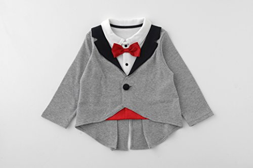 まるで燕尾服を着ているように見える重ね着風トップスとズボンの上下セットです。結婚式や七五三、特別なお呼ばれや記念撮影などに着せたいフォーマルスーツです。春や秋におススメの程よい厚みの素材を使用しました。■素材■本体:スムース 綿100%リボン・サテン生地:ポリエステル100%