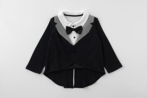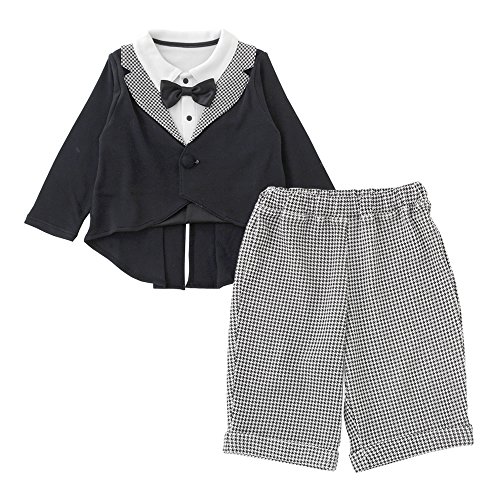 まるで燕尾服を着ているように見える重ね着風トップスとズボンの上下セットです。結婚式や七五三、特別なお呼ばれや記念撮影などに着せたいフォーマルスーツです。春や秋におススメの程よい厚みの素材を使用しました。■素材■本体:スムース 綿100%リボン・サテン生地:ポリエステル100%