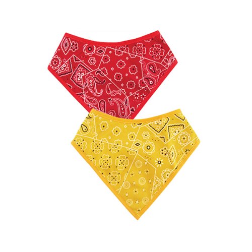 ペーズリー柄でおしゃれなバンダナスタイです。カジュアルな着こなしのアクセントになります。レッド×イエローの2枚組ブルー×レッドの2枚組の2種類販売。バラ売り、色組み替えは出来ません ホック止めタイプ 素材・・・表 綿100% 裏 綿80%、ポリエステル20% ※2009年7月より色の組み合わせが変更になりました。
