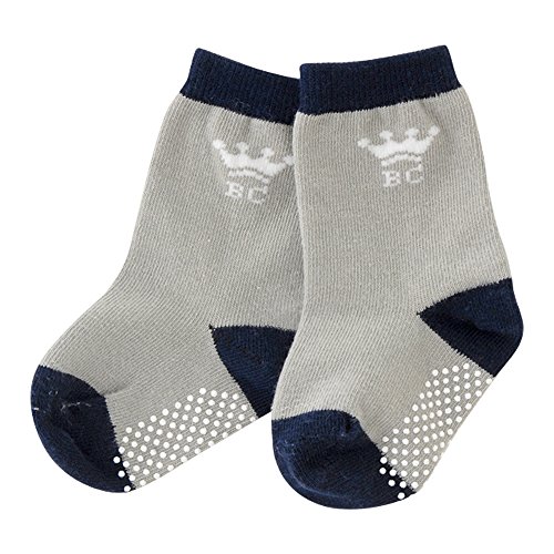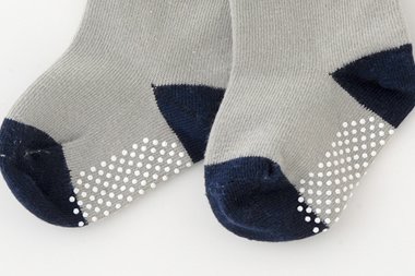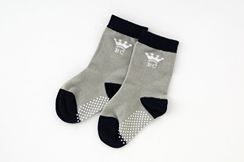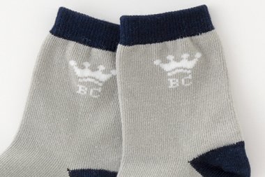 - グレーとネイビーを組み合わせたベーシックなベビー靴下です。王冠模様入りでオシャレ☆